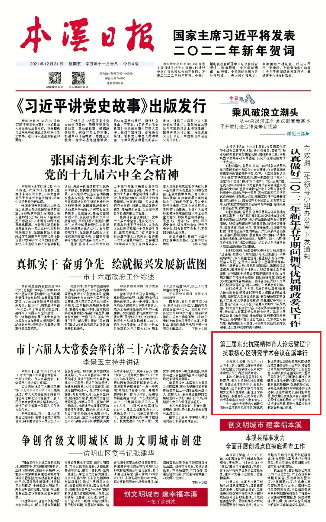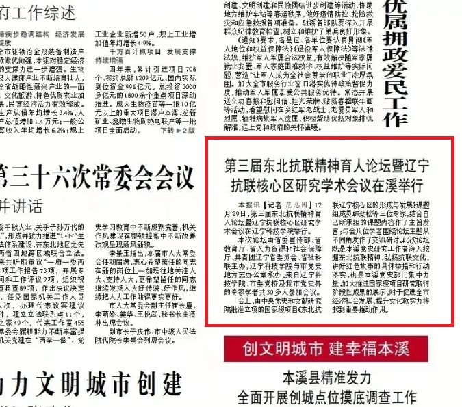 12月31日,本溪日报刊载了由省委宣传部、省教育厅、省人力资源和社会保障厅、共青团辽宁省委员会、省社科联主办,1331银河网站登录首页与中共本溪市委党史地方志办公室承办的第三届东北抗联精神育人论坛暨辽宁抗联核心区研究学术会议。