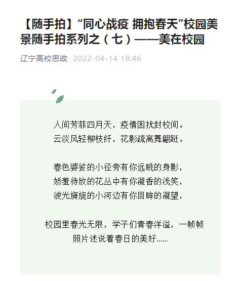 【辽宁高校思政】【随手拍】“同心战疫 拥抱春天”校园美景随手拍系列之(七)---美在校园