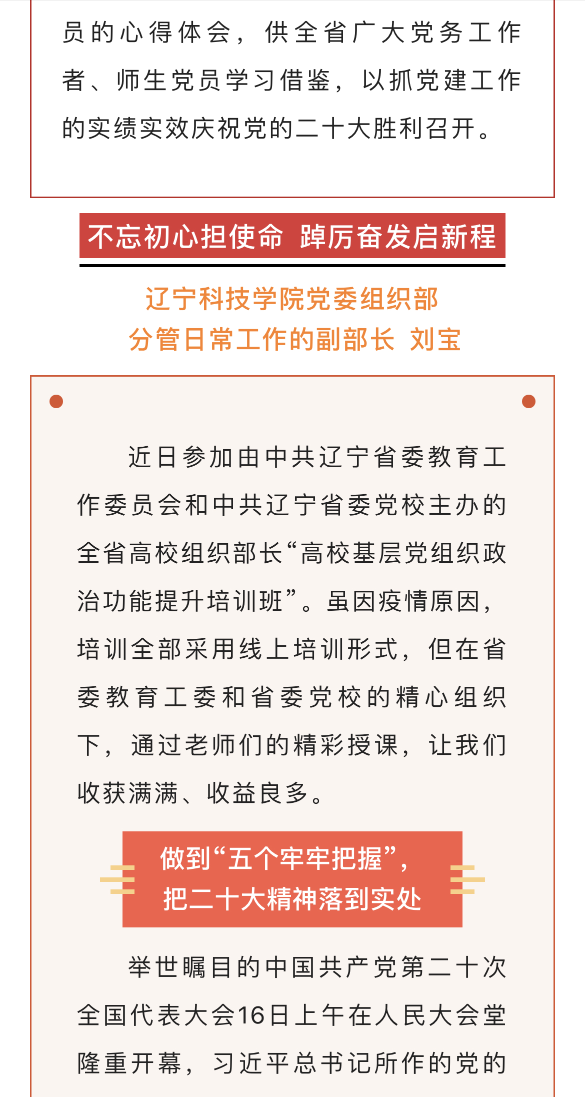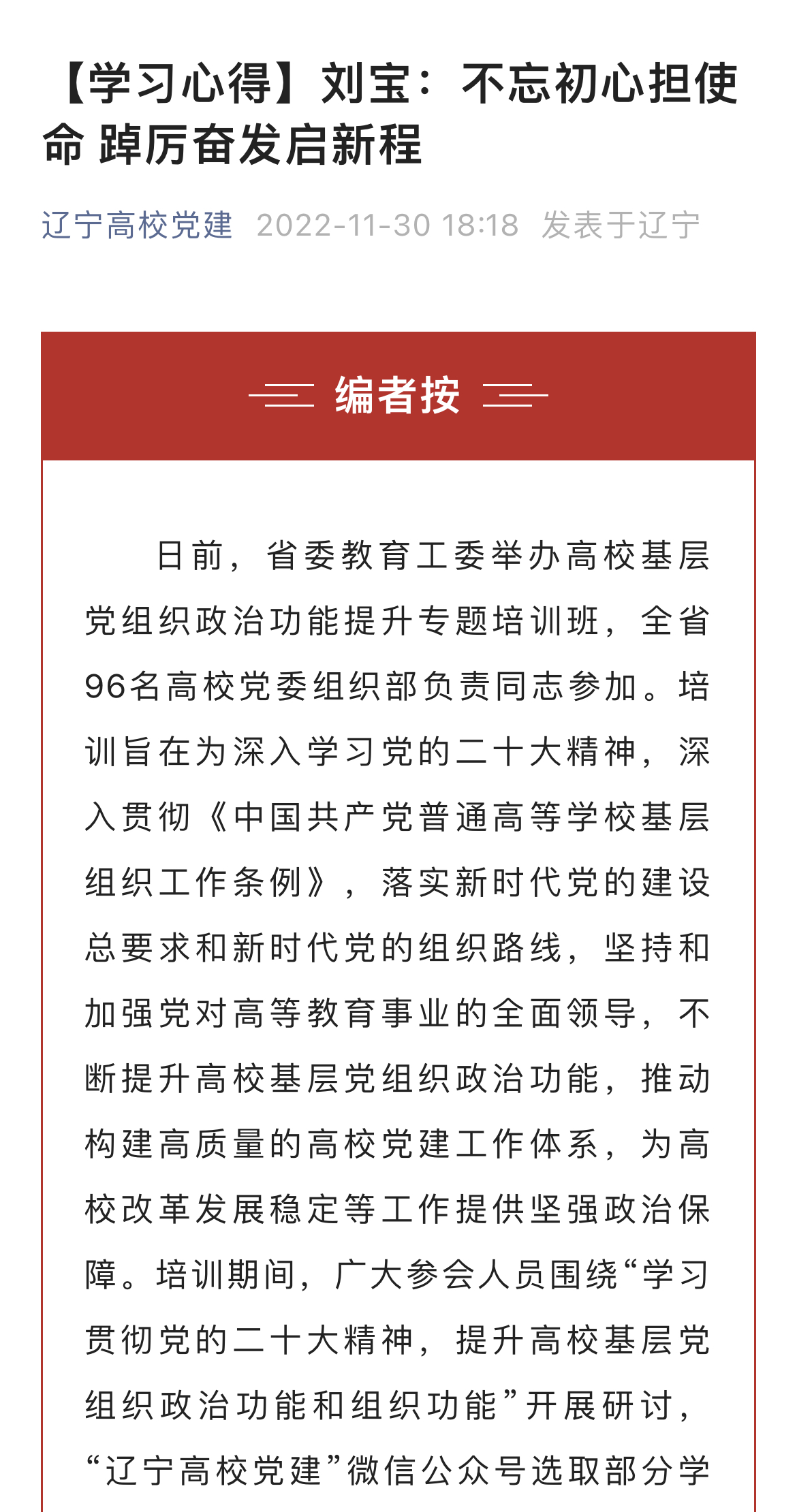 10月17日至21日,学校时任党委组织部分管日常工作的副部长刘宝参加了由中共辽宁省委教育工作委员会和中共辽宁省委党校主办的全省高校组织部长“高校基层党组织政治功能提升培训班”,并发表心得。以下是“辽宁高校党建微信公众号”刊发内容: