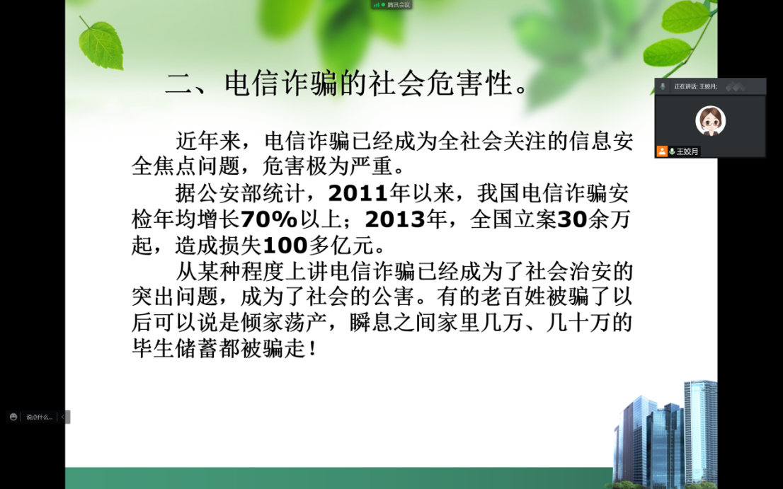 本次会议各班班主任向同学们介绍了诈骗的主要特点和类型,并着重强调如何预防诈骗。老师们主要提出了几点做法:一不透露:不贪小利或言语诱惑,有疑问应立即核实或求助110。二不轻信:不轻信不法分子的花言巧语或危言耸听,不给不法分子机会。三不转账:不向陌生人或不明账户汇款转账,保证自己的资金安全。同时老师们也举出校园近几年的案例,加大案例宣传,使学生学会认清骗局的方法,从而降低上当受骗的几率。也警醒同学们不点陌生链接,不进非正规网站,不随意拨打网络电话,更不贷款刷单,以防落入不法分子的圈套。