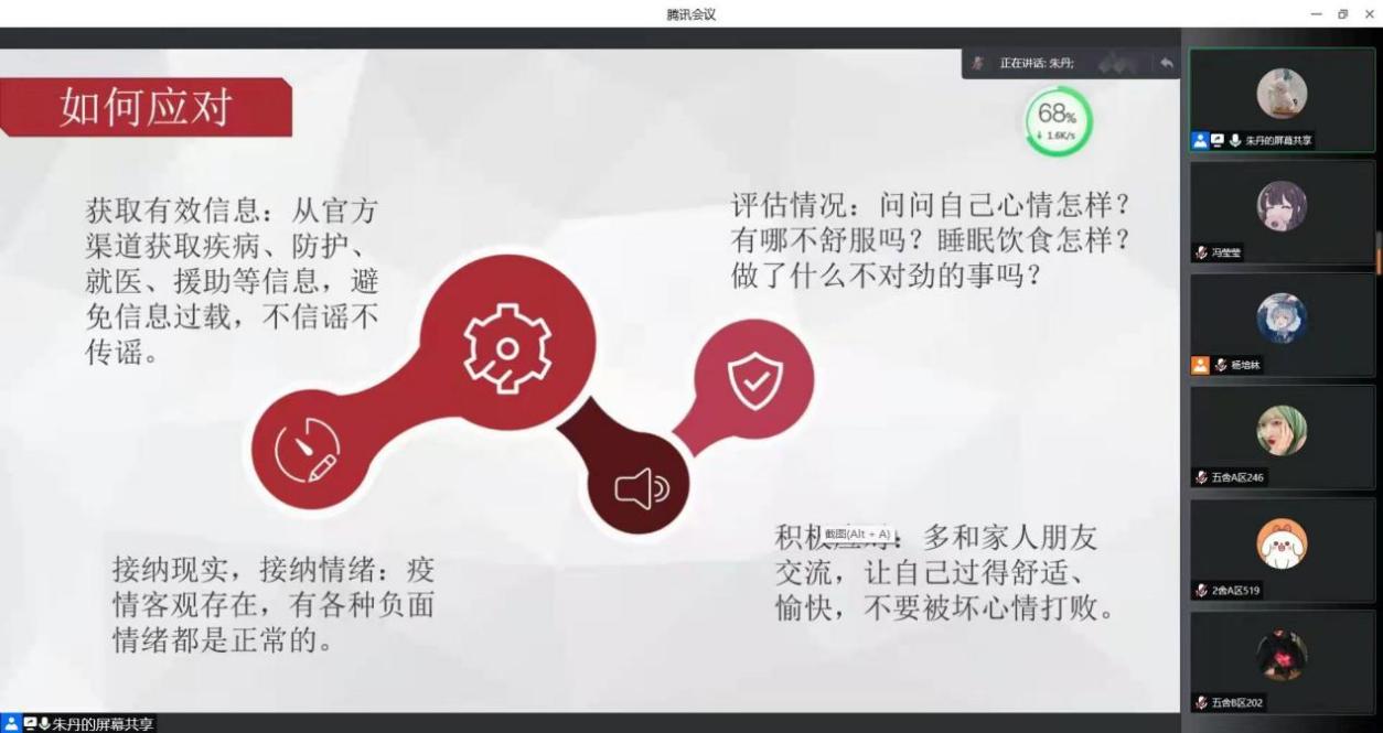 此外,朱丹老师还着重强调学生们要从官方渠道获取信息,科学认识疫情,不必过分关注负面报道,不信谣、不传谣。学生们也要避免信息过载导致的心理负担,不让疫情成为生活中的主要话题,要传递正能量,维持健康稳定的生活方式。
