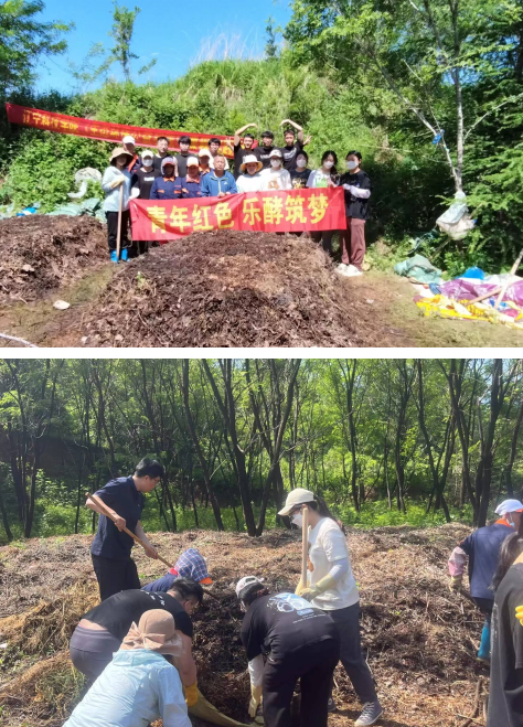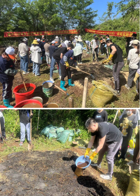 新雨初霁,山青花燃。在学校后山生态堆肥料场,后勤管理处物业中心绿化班、药化学院生物技术专业21级学生暨乐酵公益与天籁生物技术协会成员共70余人,一齐动手,将前期准备好的校园落叶、枯枝等园林废弃物原材料,按照堆肥程序依次加入鸡粪、环保酵素+红糖等生物催化剂。现场气氛积极热烈,师生们相互配合、干劲十足。堆肥场上,师生们的劳动成果随着时间慢慢积淀,待到秋来,就将化腐朽为滋养,变废料为肥料,为校园绿化提供环保绿色的有机肥料。